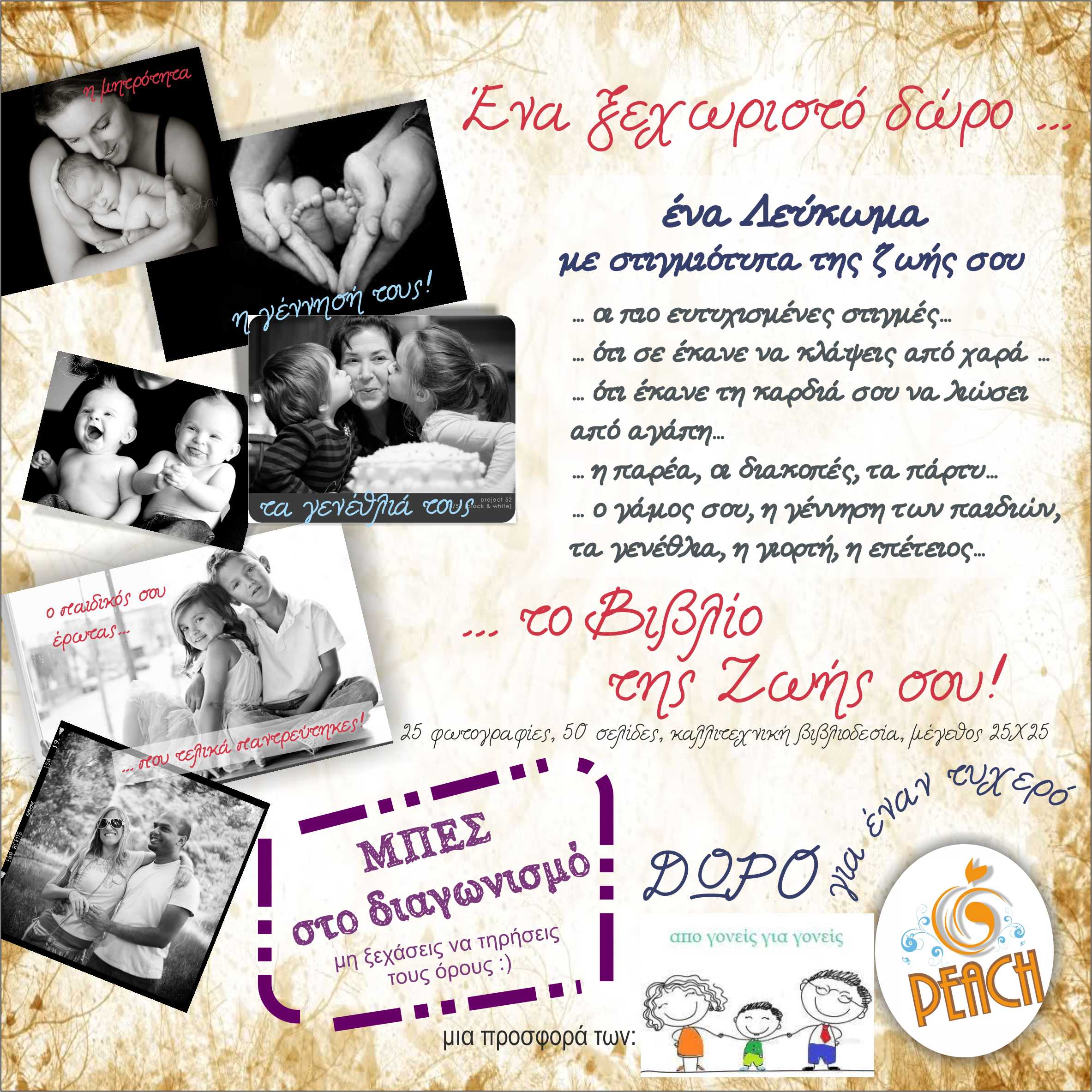 Το δώρο που θα κερδίσει ένας τυχερός, είναι ένα Λεύκωμα Αναμνήσεων που θα φτιάξουμε με 25 φωτογραφίες που αγαπημένες στιγμές της ζωής του.